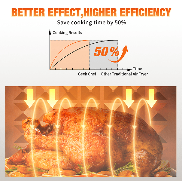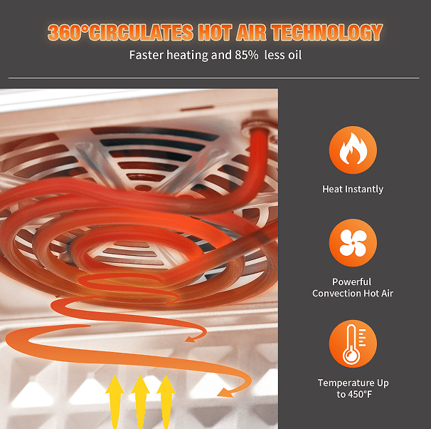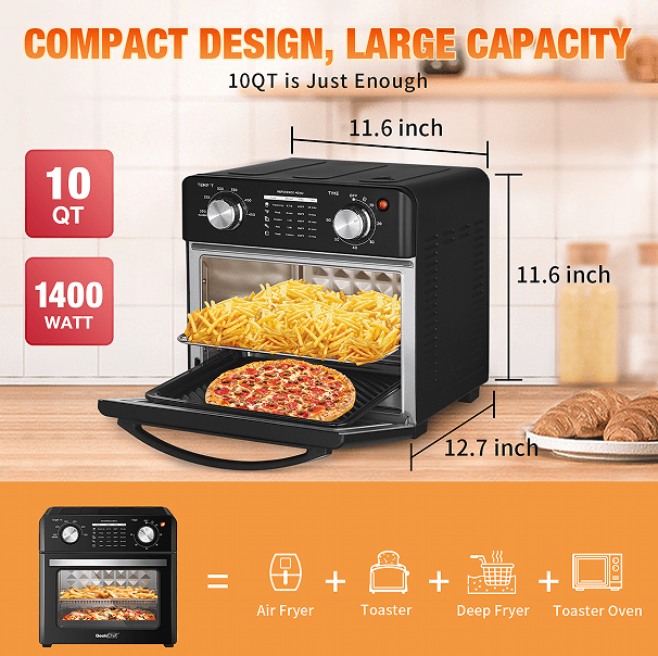 Use Easy-Free Our air fryer oven has a built-in digital screen with a one-button control panel. 10 preset-Wings, seafood, barbecue, steak, whole chicken, fries, French fries, pizza, dessert, popcorn, dehydration. Clean and comfortable. All complete accessories can be easily removed and dishwasher safe. Use the InfiniPower air fryer to make your cooking easy and create much more.