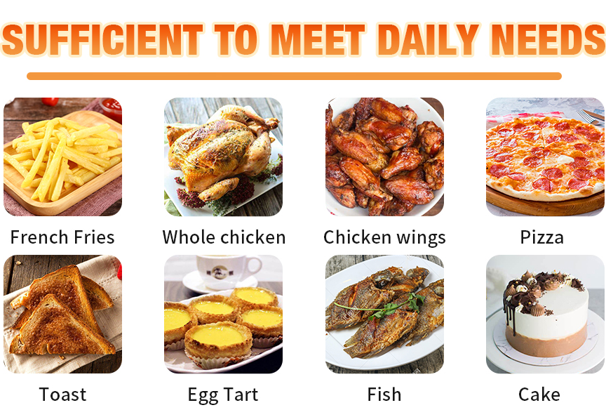 Spacious Interior Space Our InfiniPower Air fryer has a large capacity of 16 quarts, large enough to provide enough cooking space for a big meal. Perfect for roasted whole chicken, dehydration, seafood, barbecue, French fries, baking, etc. This barbecue oven can serve delicious food for your family and friends.